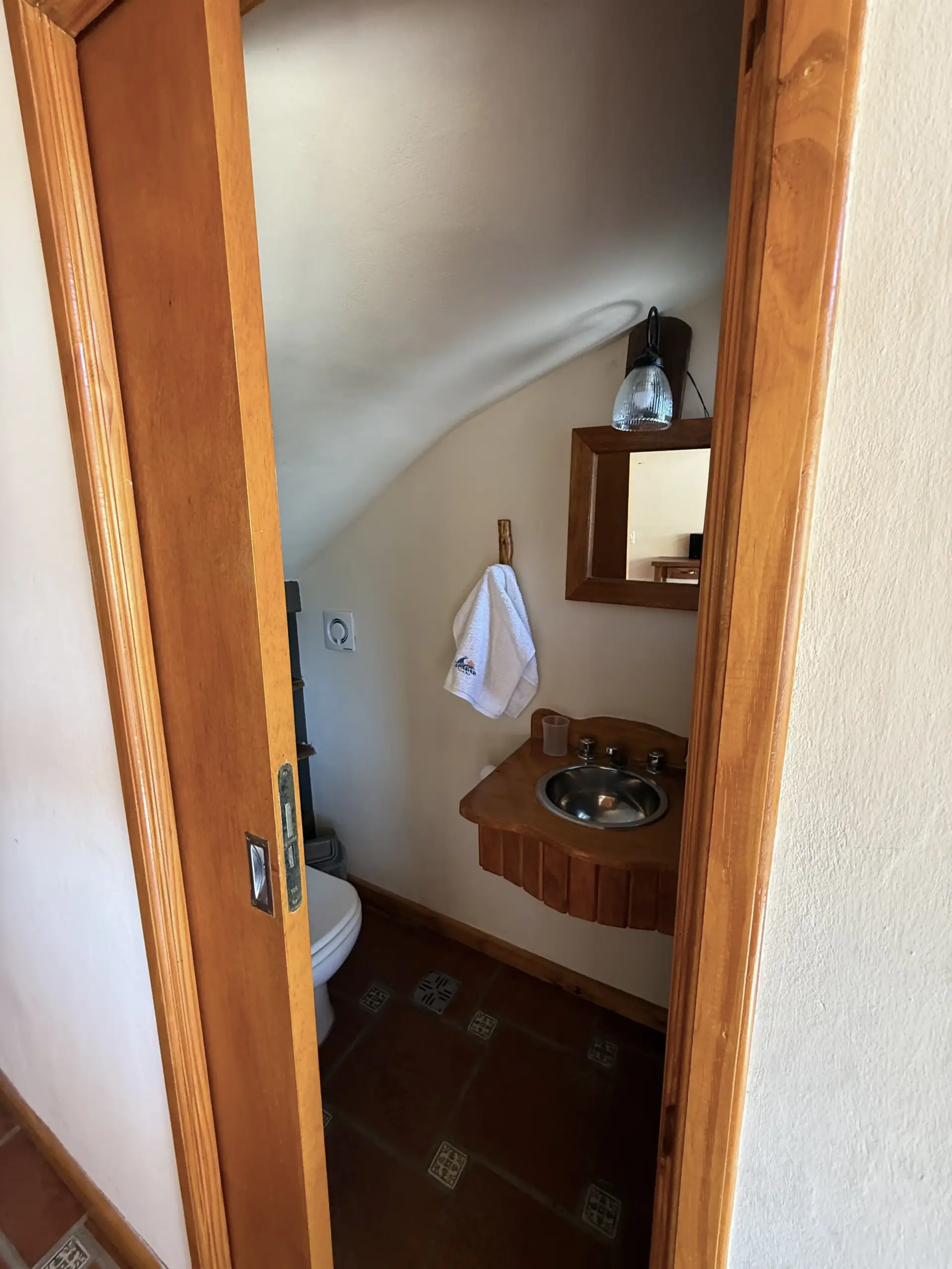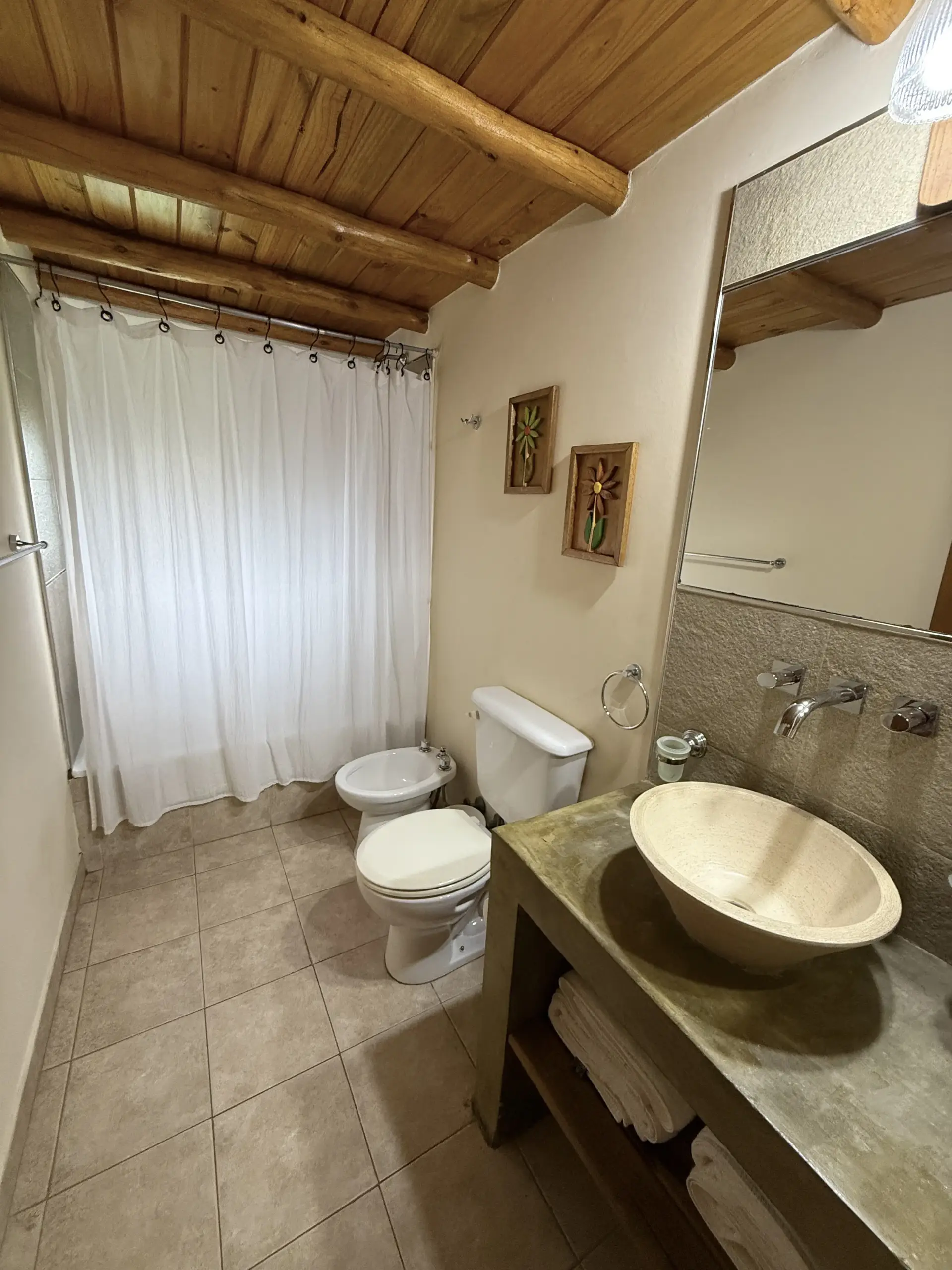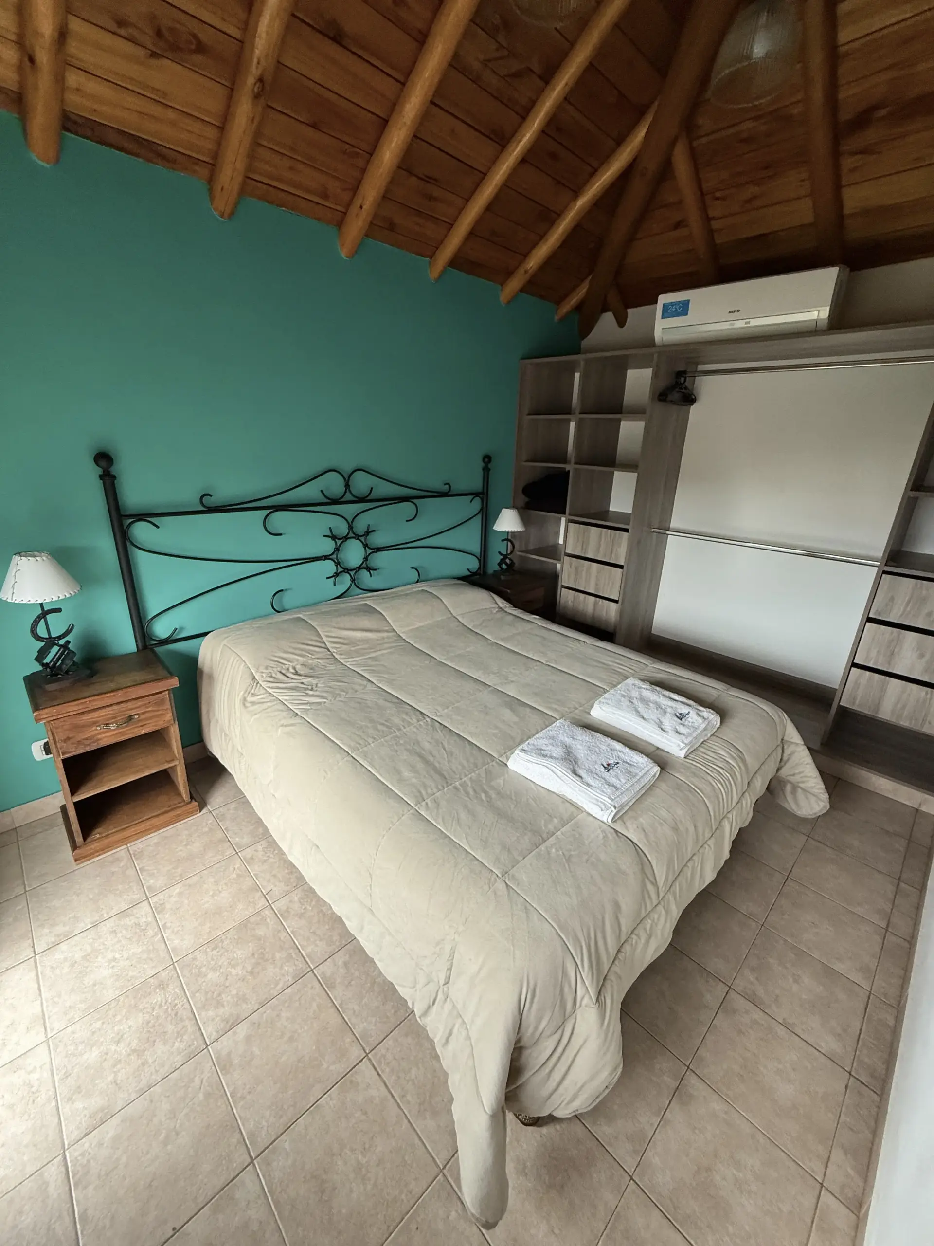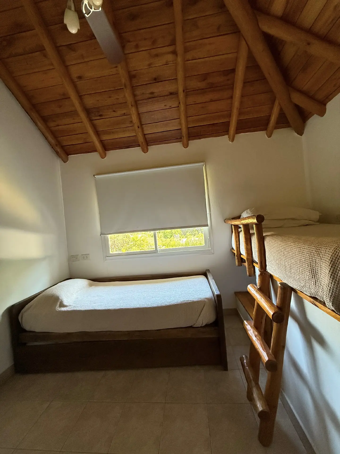 En planta alta cuenta con con dos amplios dormitorios y baño completo totalmente equipadas de primera. La habitación principal posee somiers Queen y colchón King Koil de excelente calidad que garantiza el más placentero descanso, amplio placar, TV LED CON DIRECTV. (prepago) AIRE ACONDICIONADO frió/calor y una ventana balcón con salida a un cómodo deck que invita a disfrutar del hermoso paisaje y buenos momentos. La otra habitación posee tres camas con colchones King Koil de primera calidad, ventilador de techo Martín y Martín súper silencioso.